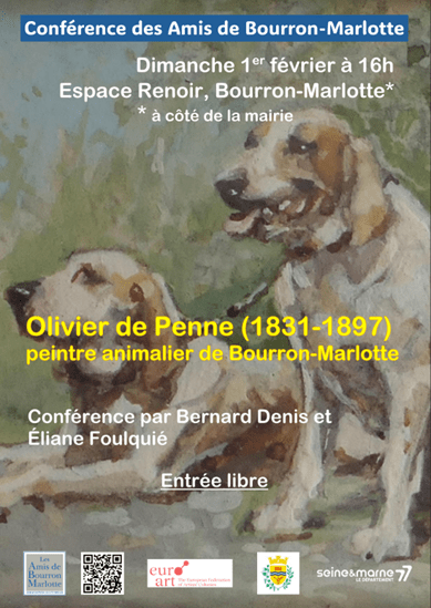 Même s’il a peint un grand nombre d’animaux de tous types, la réputation d’Olivier de Penne reste celle d’un peintre animalier, tout particulièrement connu pour ses représentations de chiens de chasse et de scènes de vénerie. La conférence sera présentée par M. Bernard Denis et Mme Éliane Foulquié, tous les deux passionnés par le monde animal et ses représentations. Elle inclura des éléments de la vie du peintre, de Paris à Barbizon puis à Marlotte, ainsi qu’une sélection de ses œuvres.
