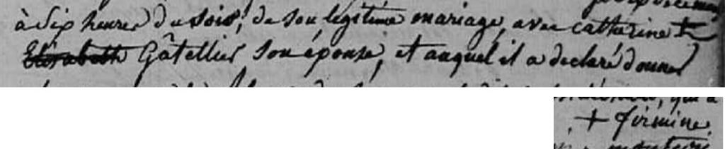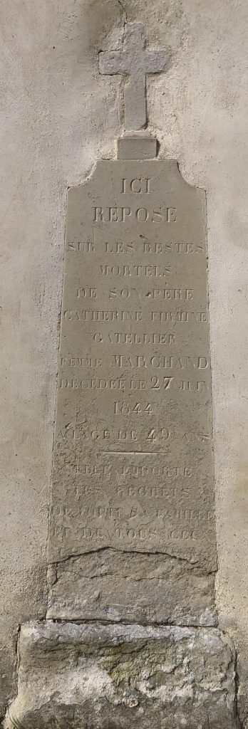 Sur les trois actes d’état-civil, les prénoms de « Firmine Elisabeth » sont inscrits, mais il y a peu de doute qu’il s’agit bien de « Catherine Firmine » mentionnée sur la stèle de l’église. En effet, il n’y a pas trace de naissance d’un autre enfant Gatellier en juin 1794 dans les registres de Bourron, ni d’un autre décès sous ce nom en juin 1844. Tel que suggéré sur l’acte de naissance de leur enfant, « Catherine » était probablement le prénom usuel de la défunte. Une erreur de transcription lors d’un regravage éventuel de la stèle pourrait également expliquer l’écart entre la date de décès gravée (27 juin) et celle enregistrée à l’état civil de Bourron (20 juin).