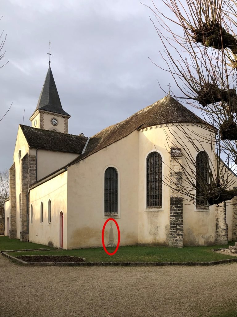 Il est donc surprenant de voir aujourd’hui une unique stèle funéraire enchâssée dans le mur du chevet de l’église, suggérant une sépulture ayant été préservée des actions mentionnées ci-dessus.